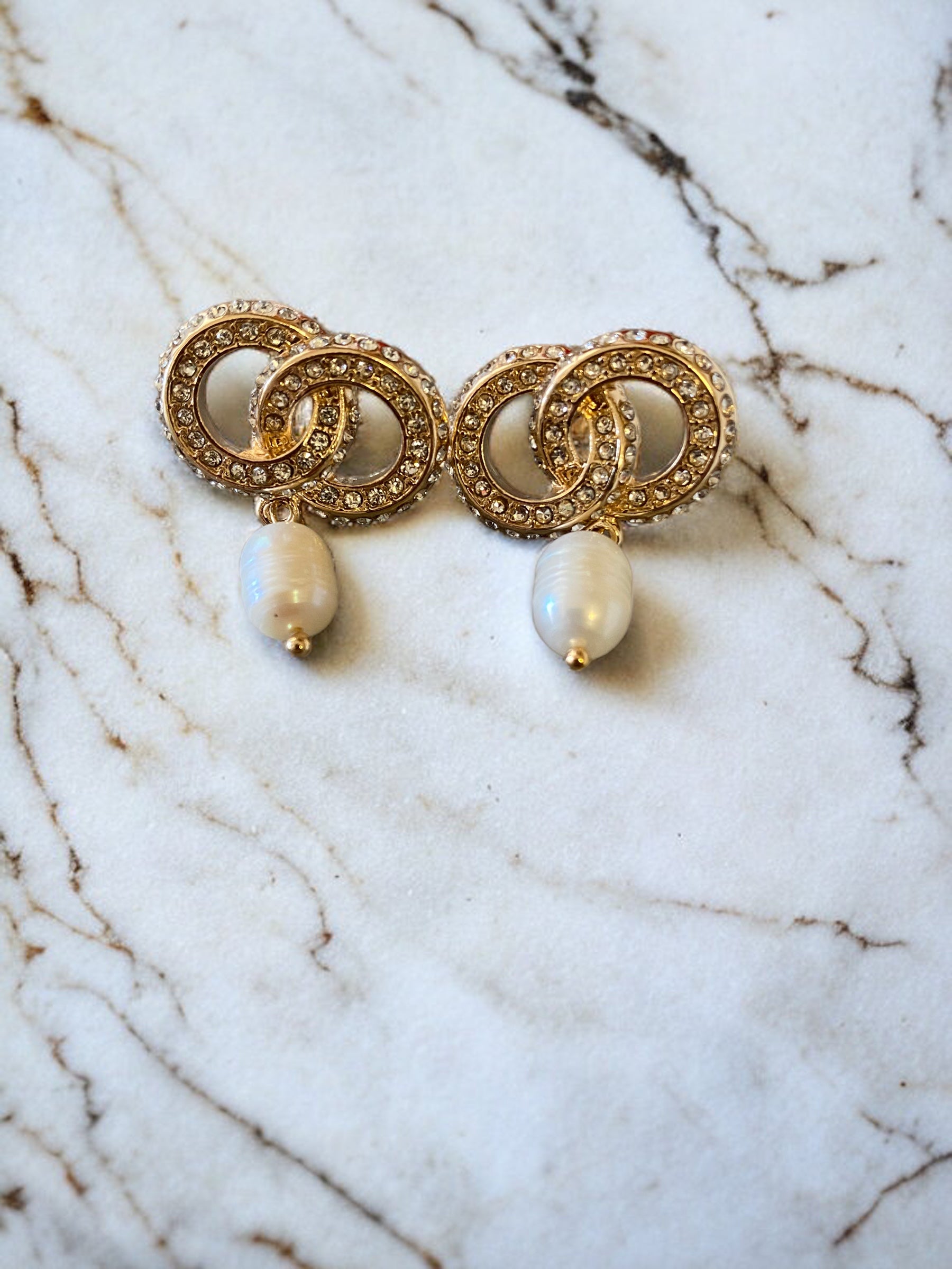 When the event is just that special these gorgeous Cultured Pearl, Gold & Rhinestone Circle Earrings are the perfect little something to add that sparkle! 1 1/2" drop. Stem hoops.